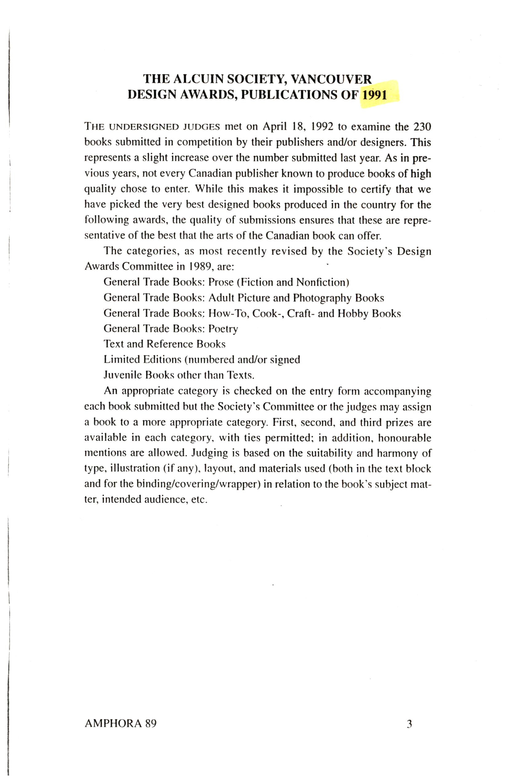 The Alcuin Society, Vancouver Design Awards, Publications of 1991